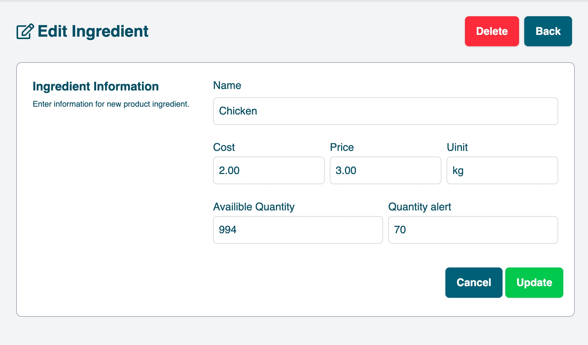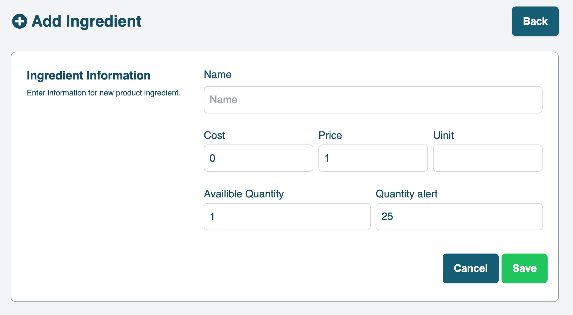 You can add new ingredients by filling up the form shown below.