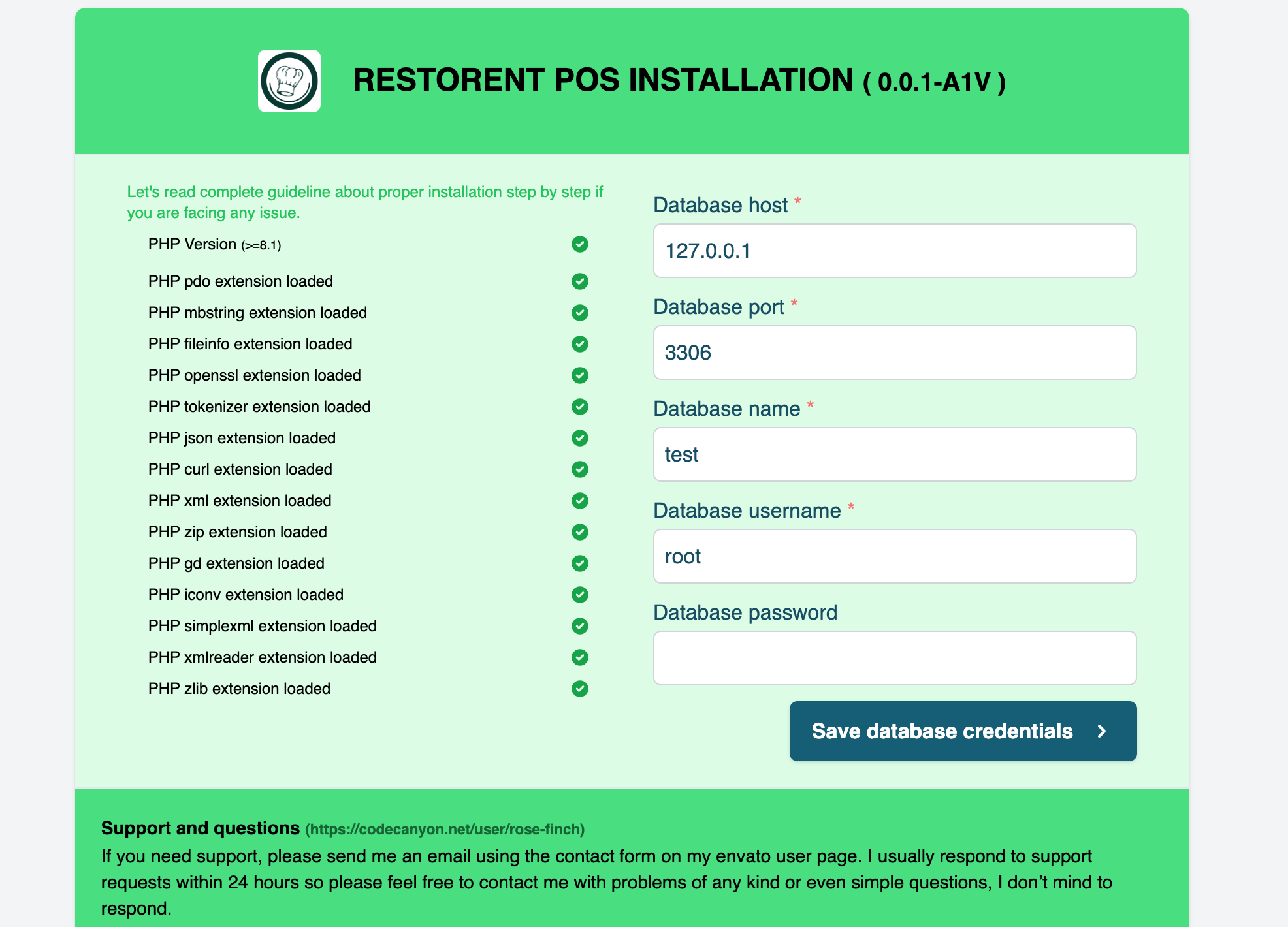 The Installer will make sure about the required extensions are installed or not. If all required extensions are installed fill in your server credentials, and database information and hit begin to install.