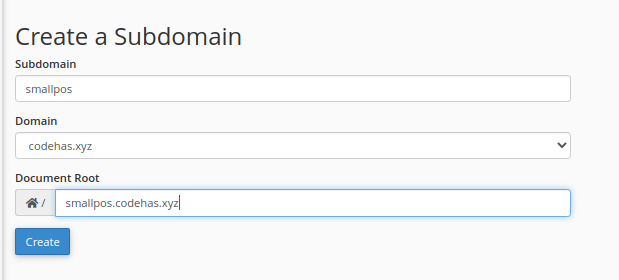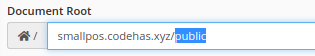 Suppose In the above image **codehas. xyz** is your domain, you are going to create a subdomain which will be **smallpos.codehas.xyz,** and the **Document Root** will be **"smallpos.codehas.xyz"**.Here the application needs to index the form directly **"/public"**. so simply add or append just `/public` in document root as shown in the image below.
