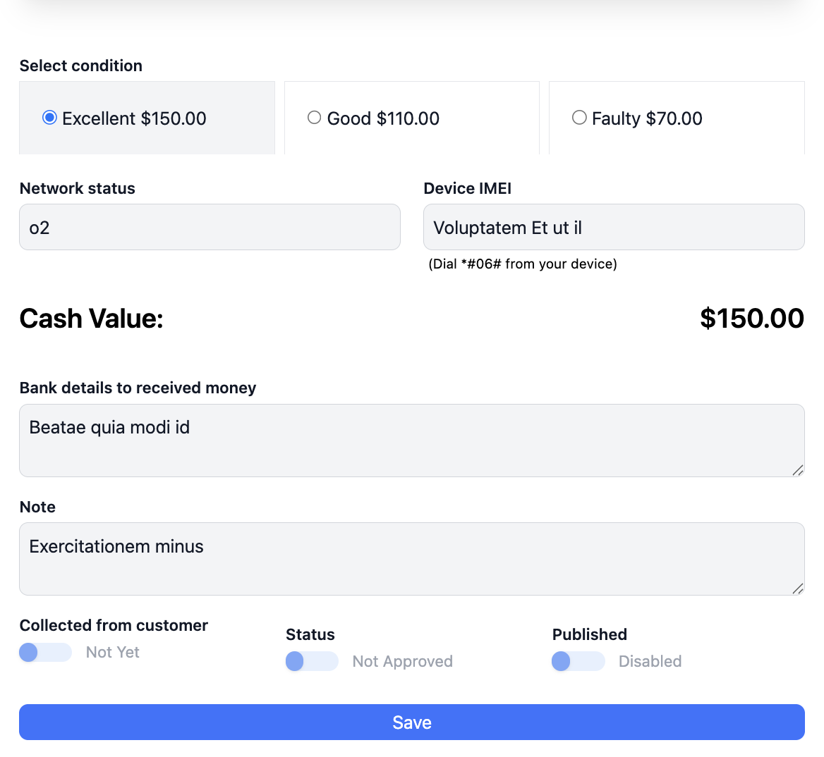 Admin reviews device details, condition, and IMEI.
