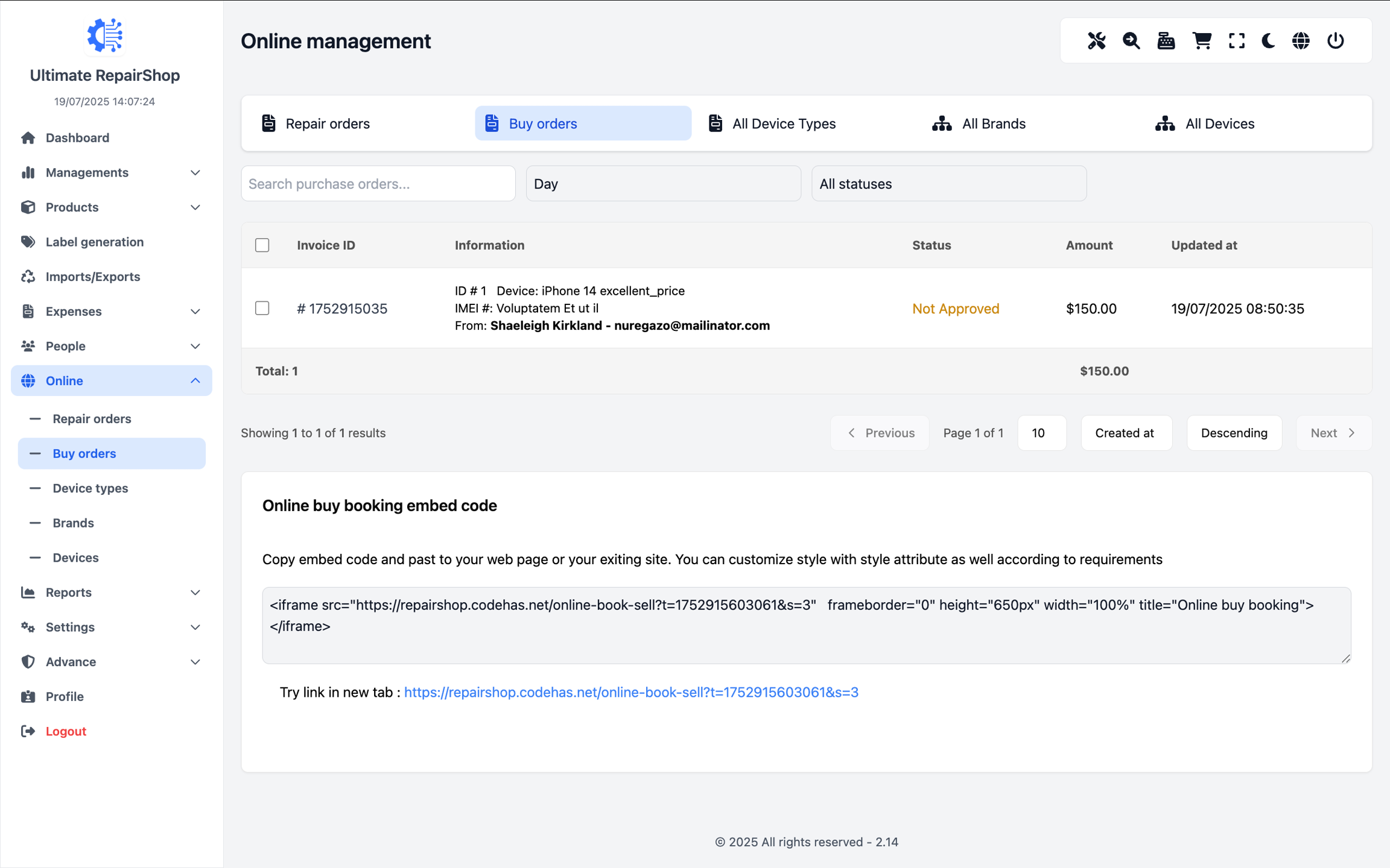 The main screen displays a searchable, paginated data table listing all online buy requests.