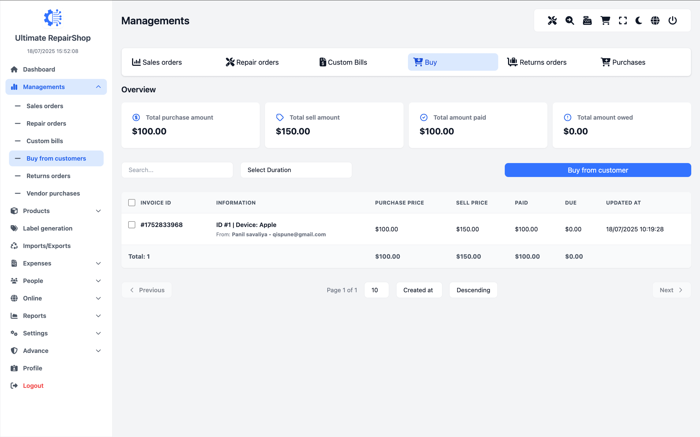 The Buy from Customer module empowers you to seamlessly handle second-hand product acquisitions — a modern resale system built right into your repair business.