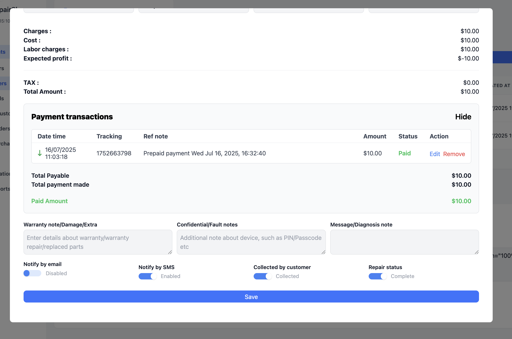 Clicking on any repair order opens a detailed view, packed with editable fields and actions: