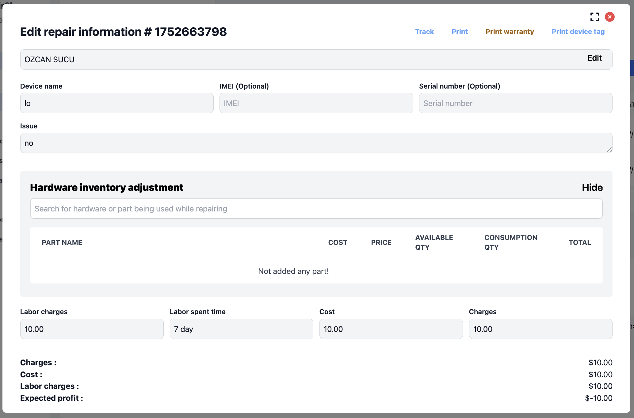 Print repair receipt/invoice