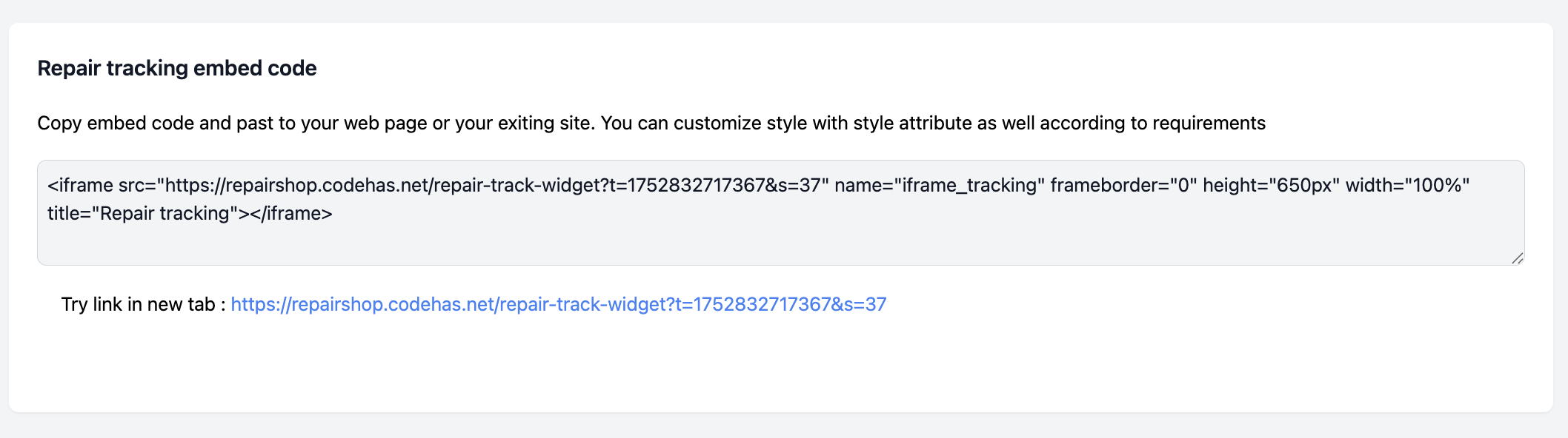 Give your customers access to their repair status with a sleek, embeddable widget. Itβs plug-and-play β just drop it into your website.