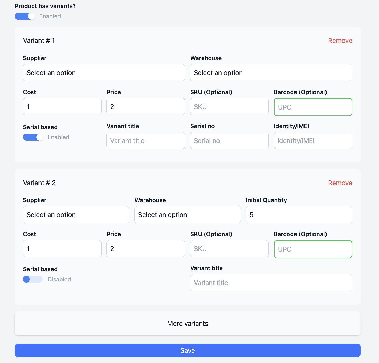 Variants? – Toggle to enable variant-based products like size/color/storage types.