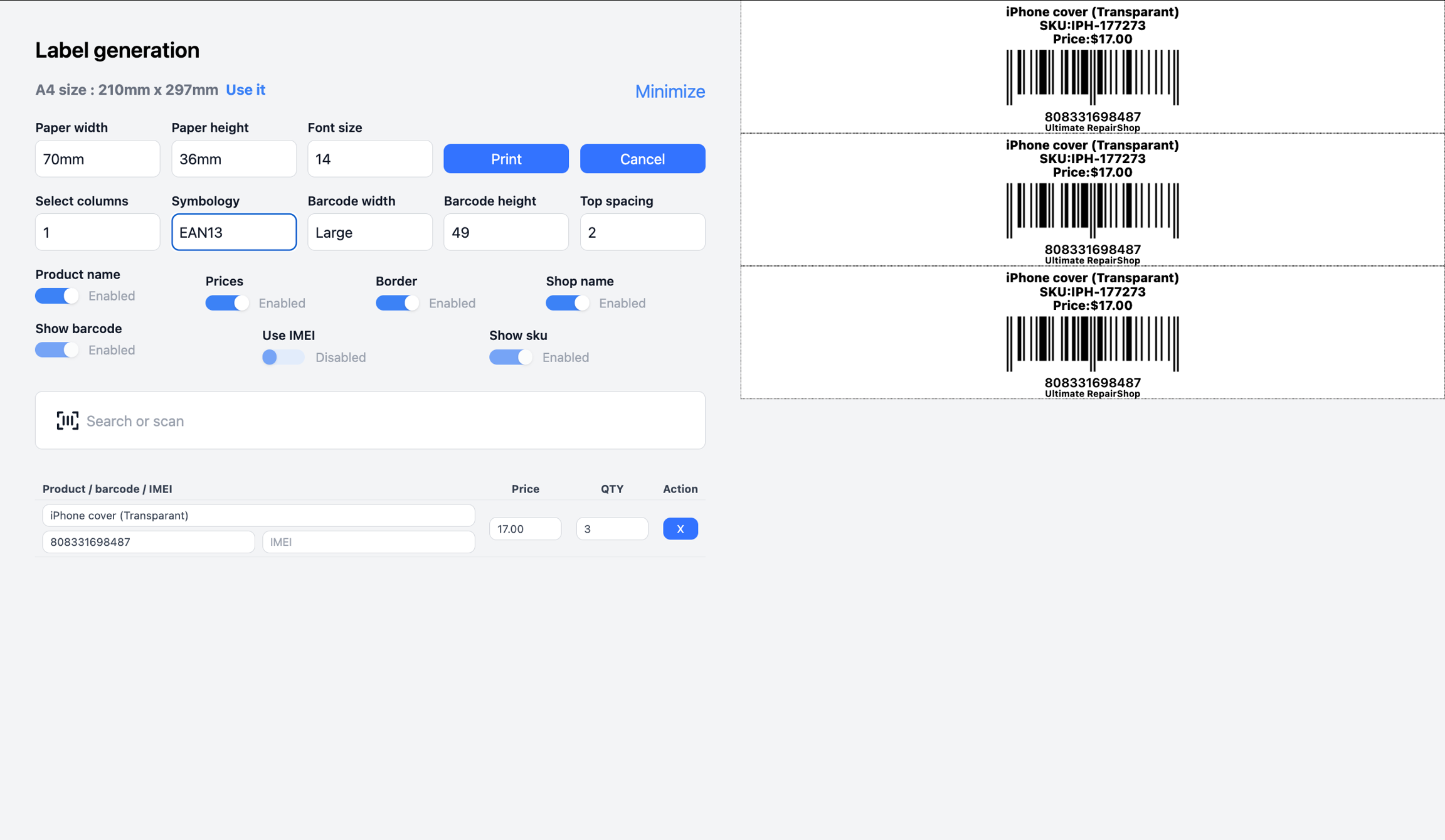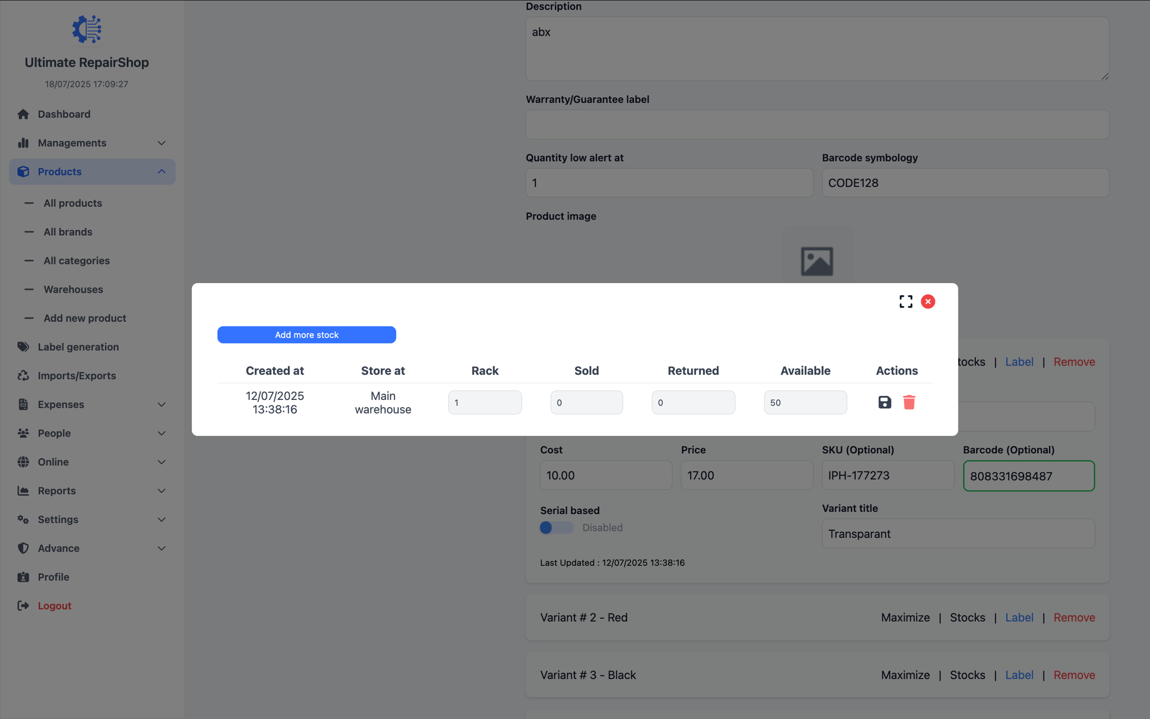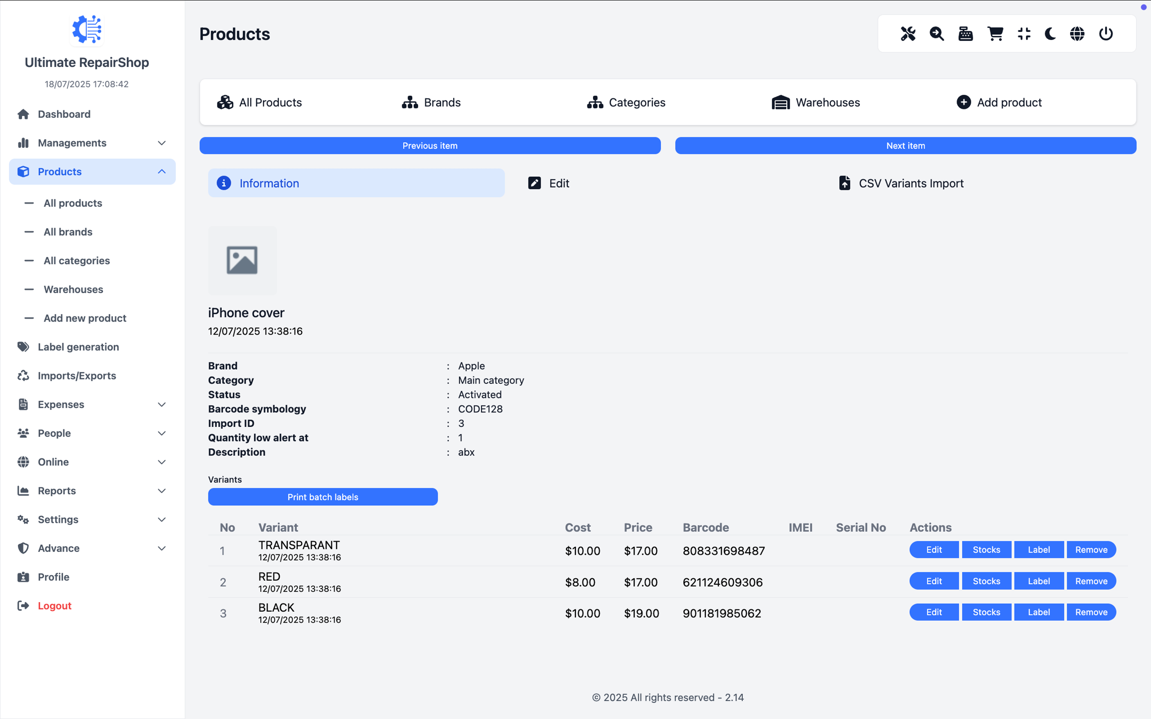 Whether you’re dealing with general products or individual variants, the system supports printing custom labels directly from the product detail page.
